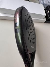 Newly developed aerodynamic mould with rough "sandpaper" surface, 18K carbon face and hybrid EVA. Easier to swing than most of the rackets due to the aerodynamic shape and redesigned holes structure. This model offers increased spin and slice potential due to its rough surface.