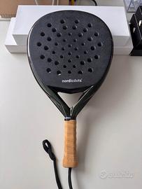 Padel NORDICDOTS Introvabile Usata poco Modello: GliderAero Peso: 355 gr Colore: verde scuro (bellissimo) Ha una forma a goccia aerodinamica, che offre un buon equilibrio tra potenza e controllo. La superficie ruvida in carta vetrata migliora lo spin e il potenziale di slice. È realizzata con una faccia in carbonio 18K. Il suo bilanciamento medio/basso la rende leggera e facile da manovrare. Dal sito: Newly developed aerodynamic mould with rough "sandpaper" surface, 18K carbon face and hybrid EVA. Easier to swing than most of the rackets due to the aerodynamic shape and redesigned holes structure. This model offers increased spin and slice potential due to its rough surface. Specifications: Structure: 18K Carbon Shape: Teardrop Core: Hybrid EVA Surface: Rough "sandpaper" finishing Weight: 350-360g Profile: 38mm Balance: Medium Protector: Factory applied piccoli ed impercettibili salti di vernice come da foto da lontano si notano poco o niente