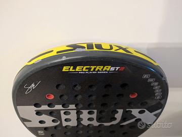 Vendo pala Padel Siux Electra Stupa ST2, usato in buono stato. Superficie ancora ruvida e sabbiosa, non presenta alcun tipo di crepe, ma solo dei punti dove é saltata la vernice nella parte superiore a causa del normale utilizzo, da cui il prezzo piú basso.