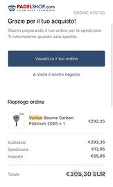 Vendo pala Varlion carbon platinum acquistata a febbraio 2026. Solo 6 partite all’attivo, peso con overgrip di 358. Piccolissimo salto di vernice nel mezzo al copritesta montato di serie sulla pala ( visibile in foto 5) Pala uscita di produzione praticamente introvabile. Considerata come la miglior pala del 2025 da Fabio Ferro. Vendo per forzata astensione dai campi da padel.