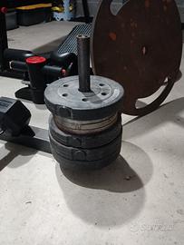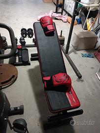 Vendo palestra in blocco come da foto i dischi grandi sono due da 20 kg , due da 15 kg, sono forati con le maniglie, panca inclinata ,sacco da box con guanti e tanti dischi da 1 ,2,5 kg.Un bilanciere professionale uno artigianale,rack completo in ferro battuto,con sbarra per trazioni, cyclette con schermo elettrico .