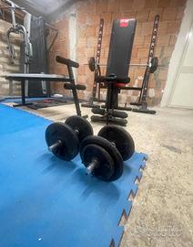 Vendesi attrezzature per palestra domestica singolarmente o in blocco ad un prezzo di vero affare. -macchinario multifunzione con 90kg di pacco pesi -panca piana per addominali - panca regolabile