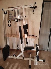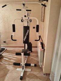 Palestra completa (Proteus Fitness Studio 3 Home Gym Machine). Con questa palestra è possibile allenare e rinforzare qualsiasi gruppo muscolare. Il pacco pesi arriva fino a 38 kg, ma volendo si possono acquistare altri pesi, ma si garantisce una resa perfettamente sufficiente per una buona fisioterapia o fitness. Insieme al macchinario fornisco la presa larga e quella corta per la lat machine e la corda, in più il poster con tutti gli esercizi disponibili. È in ottime condizioni. Volendo potete provarlo e poi lo si smonta insieme per il montaggio. La palestra Proteus si trova a Bergamo in Valle Seriana a Cene. No spedizione.