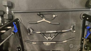 Vendo allestimento Home Gym professionale completo, acquistato nel 2020 e usato pochissimo. Tutto il materiale è in condizioni eccellenti, pari al nuovo. Un set completo "chiavi in mano" ideale per chi vuole una palestra seria in casa. Il lotto comprende: ✅ 1. MAXXUS Multipower 10.1 Stazione combinata professionale con Smith Machine (bilanciere guidato) e doppia carrucola (alta/bassa). Scorrimento fluidissimo su cuscinetti. Include: PANCA REGOLABILE professionale Maxxus. Set completo di maniglie (Lat bar, barra tricipiti, barra dritta corta, ecc.). (Attualmente montata: disponibile per qualsiasi prova). ✅ 2. Power Rack Capital Sports Amazor P Pro Struttura massiccia in acciaio con Monkey Bar per trazioni e supporti di sicurezza (J-Cups e Spotter) per allenamento con bilanciere libero. (Già smontato e pronto al carico). ✅ 3. Kit Pesi Olimpionico (50mm) Bilanciere professionale da 2.2mt (20kg). 160kg di dischi gommati modello Tri-Grip con anello centrale in acciaio (modello premium, facili da maneggiare grazie alle 3 prese). Inclusi fermadischi a collare professionali e molle di sicurezza. ✅ 4. Pavimento Gommato Tecnico (12mq) 12 piastrelle da 1mt x 1mt, spessore 2cm. Finitura media di alta qualità (facile da pulire, non sbriciola). 📍 ZONA: Monopoli (BA). 🚚 LOGISTICA: Ritiro a mano a carico dell’acquirente. Il materiale è pesante (circa 600kg totali), è necessario un furgone. Disponibile ad aiutare nello smontaggio della Maxxus.