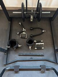 Varie maniglie, pavimento gommato, porta pesi con T bar piu pesi in ghisa e gommati e parallele per dips.