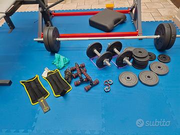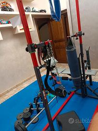 Vendo palestra, comprende una panca multifunzione weider 180 come nuova(40€) bilanciere e manubri + 50kg di dischi decathlon (100€), sbarra trazioni e dip, con supporto per i dischi e tatami da metterci sotto circa 3 metri quadrati + svariati accessori come supporto 3d per i dischi, cinta per trazioni zavorrate, polsini, fascette, pesi per caviglia, elastici, manubri per fare le flessioni, corda ecc.( 180€). Tutto praticamente pari al nuovo.