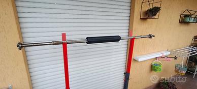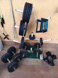 Palestra completa composta da: Panca, supporto regolabile in altezza bilanciere, bilanciere, cintura, pesi in ghisa 5kg x 10, 2 kg x 20, 1 kg x 3, 0,5 kg x 4 (tot 95 kg), coppia manubri regolabili 24 kg x 2 ( 48 kg tot), rastrelliera porta pesi, maniglie per flessioni e corda. No vendita separata. Ritiro presso domicilio zona PONTE di NONA (Roma est).