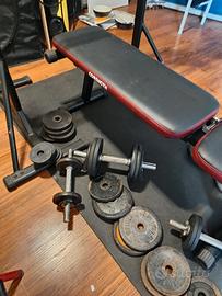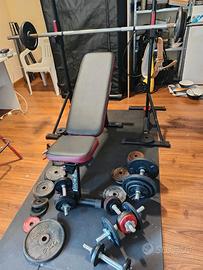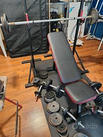 1 panca regolabile in condizioni perfette, 1 bilanciere da 20 kg, 7 manubri, 100 kg di pesi in vari tagli, 2 supporti regolabili in altezza per bilanciere, 1 sacco Vis da kg 40. cortesemente no perditempo e curiosi.