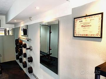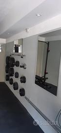 Home gym con pesi bilancieri ghisa per fare squat pesante e stacchi da terra panca per addominali e panca inclinata e manubri e rack che tiene fino a 175 kg usata 2 volte come nuova