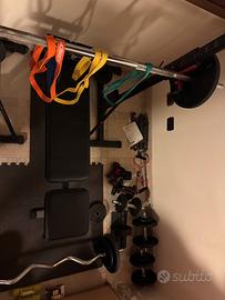 Vendo palestra completa entry-level, con: - panca con regolazione dell’inclinazione del schienale e della seduta - porta bilancere - bilancere da 2 mt - bilancere a z con presa antiscivolo e bloccaggio pesi a vite - 4 manubri (2 con bloccaggio a vite, 2 con bloccaggio con molle - 4 dischi da 10kg, 4 dischi da 5kg (2 gommati e 2 non), 4 dischi da 2 kg, 4 dischi da 1 kg - 3 bande elastiche di 3 durezze differenti - pavimentazione personalizzabile a puzzle in gomma piuma - 2 pesi da 2kg per riscaldarsi - ruota per addominali e manopole per flessioni Scambio a mano zona Marcon, Treviso, Venezia, Mestre, Scorzè