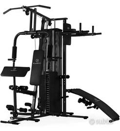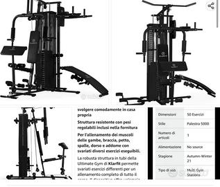 Trazione gambe per l'allenamento della muscolatura di gambe e glutei. Stazione trazione cavo con 9 dischi da 4,5 kg e un peso da 3,5 kg (peso massimo: 44 kg). Trazione a fune: cavo in acciaio con rivestimento in plastica inclusi 2 manubri da 1,5 kg. Dimensione aperto: circa 235 x 214 x 165 cm (LxHxP) Peso: circa 134,5 kg