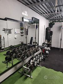 Dischi 200 kg + rastrelliere, manubri 10–34 kg, 2 bilancieri lunghi 2m, 1 corto, 1 EZ