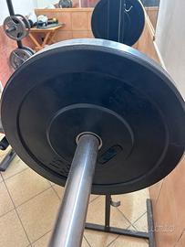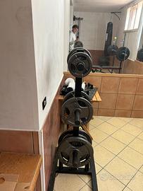 Vendo palestra in blocco, composfa di 150kg pesi (2x 15kg bumper per stacchi, 2x 20kg, 4x 10kg, 4x 5kg, 4x 2,5kg, 4x 1,25kg) Panca piana reclinabile con 6 angolazioni Porta pesi max 600kg Rack con 6 altezze