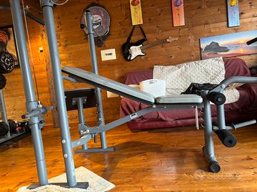 Vendo palestra multifunzione della domyos con cui potete allenare tutti i muscoli del corpo, ossia pettorali bassi, medi ed alti, dorsali, tricipiti, bicipiti e gambe. La panca e regolabile in altrzza ed inoltre lo strumento e dotato di supporto per allenare i bicipiti ed asta per dorsali e tricipiti. Inoltre mettendo i pesi davanti è possibile allenare le gambe anteriori e posteriori. Struttura in ferro verniciato a spruzzo molto resistente.