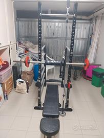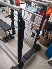Vendo a malincuore, palestra multifunzione adatta per ogni tipo di esercizio. Gli accessori: carrucola per fare tricipiti e dorsali. Cuscinetto per la schiena (per lo squat), pesi: 10 kg ×2, 5kg × 4, 2,5kg ×4, 1,25kg×4, 1kg × 8, 0,5kg × 4,tutti diametro 30mm per un totale di 65kg. Un bilanciere in acciaio (peso 12kg), 2 coppie di manubri con viti. Panca regolabile, 30-45-60-70 gradi, anche il sedile è regolabile. Tutto quello che vedete in foto è compreso nel prezzo. Vendo solo in blocco e a domicilio (potete visionare e poi portare via).