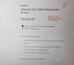 Vendo palestra multifunzione KLARFIT completa, solida e funzionale, perfetta per allenare tutto il corpo a casa senza abbonamenti e perdite di tempo. Consente allenamenti completi per: petto, schiena, spalle, braccia, addominali e gambe (lat machine, chest press, butterfly, leg extension/curl, cavi) Struttura robusta, stabile, imbottiture in ottimo stato. Ideale sia per principianti sia per chi si allena regolarmente.