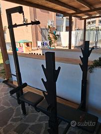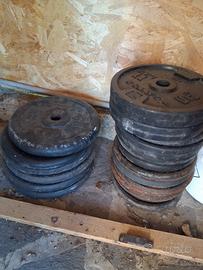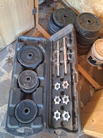 tantissimi pesi più di 150kg/panca multifunzione/attrezzo per addome e trazioni/3 bilancieri di varie misure/6 manubri/è tutto molto impolverato perché non viene usato niente ormai da tempo