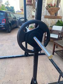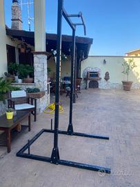 Vendo rack artigianale, è solo da riverniciare. Ferro zincato di ottima fattura, comprende un bilanciere di 180 cm lineare. Il rack possiede due porta peso sulla parte posteriore ed una barra superiore per trazioni.