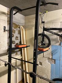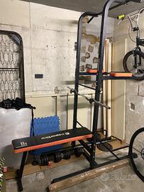 Panca in ottimo stato con schienale specifico per trazionare e addominali altri con supporto gomiti insieme ci sono 2 bilancieri con relativi pesi e manubri con relativi pesi. Tappetino .