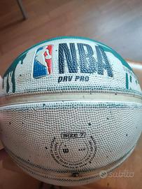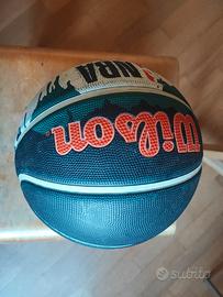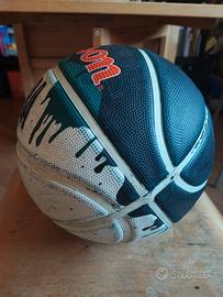 Vendo palla da basket Wilson originale, modello NBA DRV Pro. La palla è di misura standard 7, ideale per partite e allenamenti all'aperto o al chiuso. Presenta un design unico a due colori, verde/blu scuro sopra e bianco sotto, separati da un effetto a goccia stilizzato. Perfetta per chi cerca un pallone robusto e con un ottimo grip.