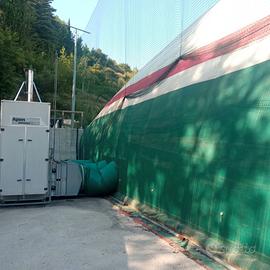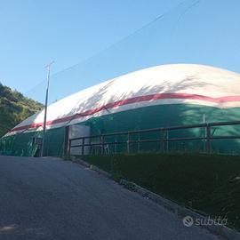 2a copertura pressostatica 2017 con telo doppia membrana in discrete condizioni completa di n.2 porte di emergenza, due porte d'ingresso girevoli, tubi di ancoraggio, impianto elettrico, gruppo sostentamento e di emergenza, bruciatore, fari, etc...