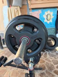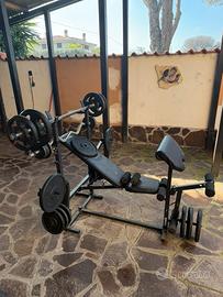 Panca 2 bilancieri 2 manubri 8pesi da 10kg 8 pesi da 5kg 6ferma pesi + ruota per addominali il tutto pagato 6 mesi fa’ euro 740 vendo a euro 350