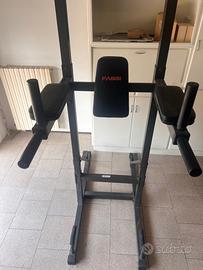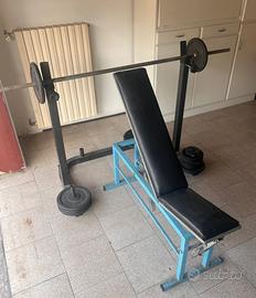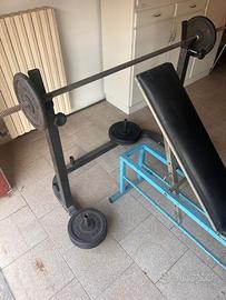 Vendo Panca Professionale palestra (anni 90) con schienale e seduta regolabile (lunghezza 1,20m) compresa di supporto per bilanciere (lunghezza 1,80m) e base per dischi (2x0,5kg + 10x1kg + 6x2kg + 6x5kg + 2x10kg). Inclusi due manubri. Inclusa Power Tower Barra per Trazioni e Pettorali.