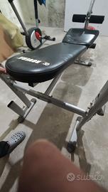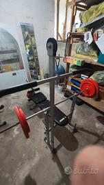 Panca reclinabile con bilanciere e 90kg di pesi. Manubrio per esercizi ai pettorali e dorsali.