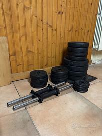 Vendo panca regolabile con annessi bilanciere (diam 28) e bilanciere EZ (diam 25) + coppia di manubri. Pesi per bilancieri: -4 da 10kg -4 da 5kg -4 da 2 kg -12 da 1kg Pesi per manubri: -4 da 5kg -4 da 2,5kg -4 da 1,25kg -4 da 0,75 kg VENDO IN BLOCCO…no pezzi separati.