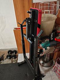 Vendo panca con porta bilancere, panca inclinabile in un paio di posizioni e reclinabile quando non si utilizza per occupare veramente poco spazio. Sono dotate di maniglie( vedi foto) per poter svolgere anche altri esercizi. Vendo a 80 euro con bilancere tecnogim da 1.50 ( solo quello ha circa il valore di tutto) o 50 euro senza bilancere. L unico difetto riportato come nella foto è il mini taglio sulla panca.