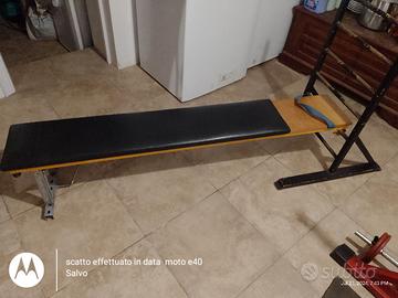 panca da palestra molto robusta,era una panca per addominali trasformata in panca piana aggiungendo la staffa da un lato e dall' altro si aggancia alla rastrelliera dove all' estremità è possibile aggiungere parallele auto costruite(parallele non presenti).