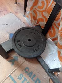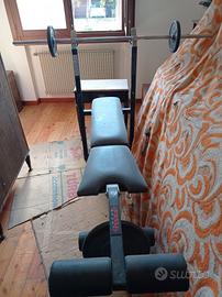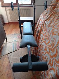 panca da palestra con bilanciere e pesi, schienale inclinabile,si può fare sia braccia che gambe. due pesi da 5 e due pesi da 15.Usata poco.