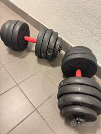 Set di pesi manubri che nel totale formano 19 kili per manubrio, con dischi assemblabili per regolare i manubri secondo proprio target di peso.