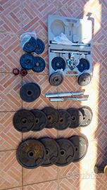 Vendo Panca come in foto con vari pesi, 51 kg in totale, suddivisi in: 4 da 5 kg 6 da 2 kg 4 da 1.5 4 da 1,25 8 da 1 kg