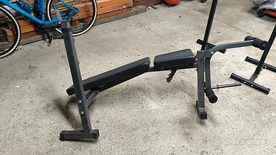 panca da assemblare robusta e professionale, si puo inclinare verso il basso e verso l alto , con leg exstension, piu supporti per bilanciere per squat a parte e un bilanciere lungo da 25mm