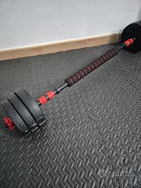 Set di pesi da 4x1,25kg, 4x1,5kg, 4x2kg, aste e chiusure per i manubri e un bilancere come mostrati nelle foto.