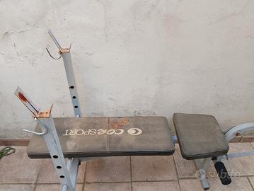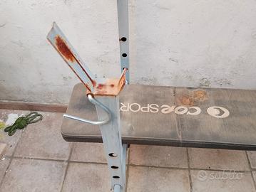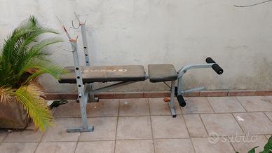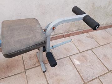 panca multifunzione per bodybuilding, un attrezzo versatile per l'allenamento a casa che combina diversi esercizi in un'unica struttura. Caratteristiche dell'attrezzo Questo modello è progettato per allenare vari gruppi muscolari: Panca con supporti: Dispone di supporti verticali per alloggiare un bilanciere, permettendo di eseguire esercizi come la panca piana per i pettorali. Leg Extension: Nella parte anteriore è presente un modulo per le gambe, ideale per estensioni e curl delle gambe. Struttura: Il telaio è realizzato in acciaio verniciato con piani imbottiti per il comfort durante l'uso. Decathlon Club Decathlon Club +3 Modelli Simili L'attrezzo nell'immagine presenta forti somiglianze visive con prodotti di marchi noti nel settore del fitness: Domyos (Decathlon): Diversi modelli multifunzione presentano una configurazione analoga con panca piana/inclinata e modulo per le gambe.