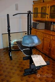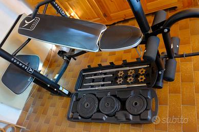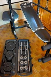 Panca decathlon Domyos BM490 più kit pesi 50kg Domyos body training in valigia trolley. Usata pochissimo, sedute e manopole come nuove. Solo ritiro di persona.