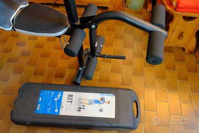Panca Decathlon Domyos BM490 più kit pesi 50kg Domyos body training in valigia trolley. Usata pochissimo, sedute e manopole come nuove. Solo ritiro di persona.