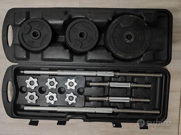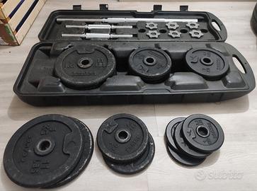 Pesi in ghisa: 6 da 5 kg, 10 da 2 kg, 4 da 1 kg e 4 da 0,5 kg.