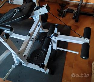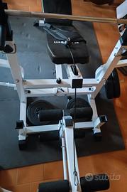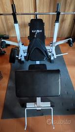 Panca perfetta per la gymhome. Include due sostegni regolabili in altezza per il posizionamento del bilanciere, supporto per effettuare curl ed esercizi di isolamento del bicipite, cavo e pettorina per esercizi di addome. Possiede due sostegni per posizionare i dischi quando non utilizzati. La panca è regolabile in inclinazione