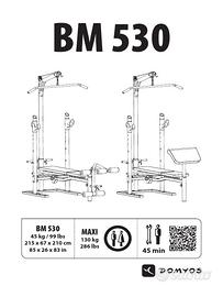 vendo stazione palestra bm530 ripiegabile causa inutilizzo in perfette condizioni usata pochissimo ottima per allenare oltre i pettorali anche le gambe più lat machine.No bilanciere no pesi Visionabile di persona