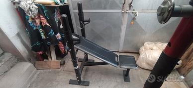 Lunghezza panca 110 e larghezza 58 circa, seduta alta 40cm da terra e pali porta bilanciere alti 120