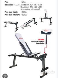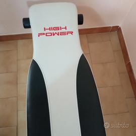 Panca palestra High Power multifunzioni( vedi seconda immagine) Ho messo buone condizioni perché in un angolino la pelletteria si e' un po rovinata( vedi ultima foto) ma per il resto la panca è tutto apposto. Misure:134×67×43
