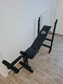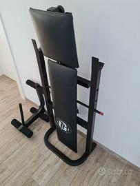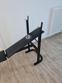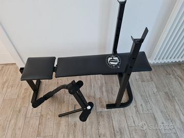 Vendo panca multifunzione usata ma in condizioni perfette. La panca pesa intorno ai 16 kg e le misure , quando piegata, sono: altezza 125 cm, larghezza 71 cm e profondità 32. L'altezza del supporto (rack) del bilanciere (non regolabile) è di 95 cm e la misura esterna è di 71 cm. Unico neo, visibile nell'ultima immagine, un impercettibile taglietto riparato con toppa in vinile. Solo ritiro in zona!!
