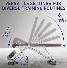 uesta è una panca per sollevare pesi versatile progettata per allenamenti completi, con un design pieghevole ideale per il fitness a casa. Offre inclinazione, declinazione e posizioni piane con capacità di piegamento rapido e regolazione rapida (in nero). I punti salienti includono una struttura in acciaio robusta che fornisce un supporto solido per allenamenti intensi, con un design meccanico che utilizza una struttura a doppio triangolo e doppie supporti per una stabilità ottimale. Questa panca esercizi fornisce sei impostazioni diverse per il dorso, quattro impostazioni per il sedile e tre impostazioni per le gambe. Pertanto, questa panca esercizi versatile può essere utilizzata come panca inclinata, declinata o piatta. Ciò consente di eseguire esercizi in qualsiasi posizione. L'adeguamento a scala a pioli è rapido e sicuro, consentendo agli utenti di apportare modifiche in pochi secondi.