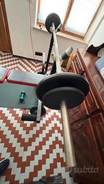 Panca regolabile con bilanciere da 180cm , con due manubri e con 50kg di pesi .