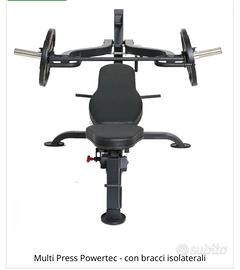 Workbench Multi Press Isolateral Usata solo a scopo dimostrativo. In ottimo stato. “Si possono fare Tutti gli esercizi di distensione migliori con sicurezza e controllo assoluti!” Workbench Multipress “Tutti gli esercizi di distensione migliori con sicurezza e controllo assoluti” Il vantaggio Workbench: I bracci di leva conducono l’esercizio, i dischi sono caricati direttamente sulla leva che in pratica la resistenza naturale dei pesi liberi con la sicurezza e il controllo di una macchina. Powertec Workbench Mutipress Il vantaggio della MultiPress 2019: I bracci di leva conducono l’esercizio, i dischi sono caricati direttamente sulla leva che in pratica la resistenza naturale dei pesi liberi con la sicurezza e il controllo di una macchina. Sistema di collegamento della panca: La panca del MultiPress incorpora un meccanismo di collegamento Powertec che consente alla sezione della panca di scorrere dalla posizione anteriore a quella posteriore con facilità, per regolarla nelle varie posizioni, da inclinata per allenare il pettorale nelle varie angolazioni, a verticale per allenare le spalle, oltre a fornire un supporto di stabilità anteriore per tutti gli accessori disponibili come optional. Il MultiPress include l'adattatore del tubolare anteriore studiato per ospitare tutti gli accessori optiional della macchina Workbench Multipress. Il modello 2019 include la barra anteriore da applicare ai bracci di leva per eseguire i movimenti con presa stretta o media. DESIGN DELLA PANCA REGOLABILE: PIANA, INCLINATA, DECLINATA: Il nuovo design fornisce ulteriore stabilità e consente agli utenti di regolare facilmente l'area di seduta e lo schienale in diverse regolazioni grazie al suo esclusivo carrello di scorrimento con cuscinetti a sfera. La panca ha 9 posizioni orizzontali e 9 posizioni verticali, comprese le posizioni declinata. Ps i pesi sono venduti separatamente.