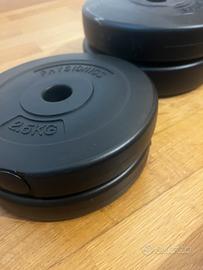 usata un paio di volte, non presenta diffetti o graffi comprende due bilanceri, 2x dischi da 2,5kg e 2x da 5kg