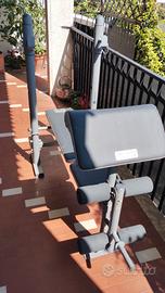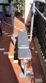 Libero spazio in garage e vendo panca piana Domyos. Usata pochissimo. ✅ Portata max 130kg + peso atleta: solida e sicura ✅ Telaio in acciaio robusto, zero giochi o oscillazioni ✅ Imbottitura compatta ✅ Gomme protettive integre su tutti gli appoggi Ha solo leggeri strisci sui supporti bilanciere, normali dopo qualche sessione. Segnalo per trasparenza un piccolo segnetto su un cuscinetto gambe, puramente estetico. Funzionalità 100%.
